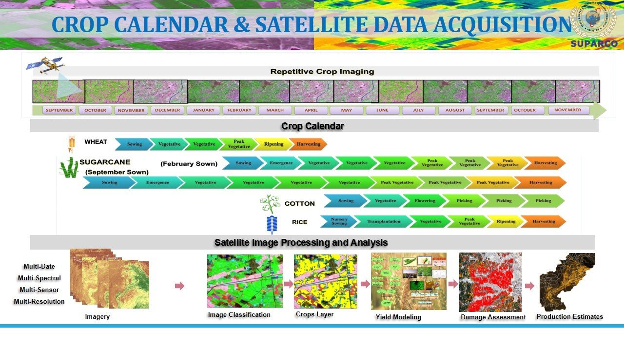 Satellite-based crop estimation in Pakistan provides comprehensive insights into the area, production, and yield of major crops including wheat, sugarcane, rice, and cotton. These estimates, generated through remote sensing analytics, help assess seasonal trends, provincial contributions, and the impacts of floods and climatic variability. The data supports food security planning, agricultural policy formulation, and informed decision-making, though the estimates are based on satellite analysis and are not field-validated.